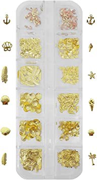 Kit com 12 modelos; -Caixa acrílica com divisórias; -Tampas individuais numeradas; -Cor dourado metálico; -Formato Concha grande e pequena, folhas grande e pequenas,coqueiro, ancora e estrela do mar; -Alto Brilho; -Ideal para Decoração de unhas; -Ideal para Maquiagem artística; -Ideal para decorações em óculos, e capas de celulares; Ideal para Artes e desenhos em geral; -Fácil de aplicar.