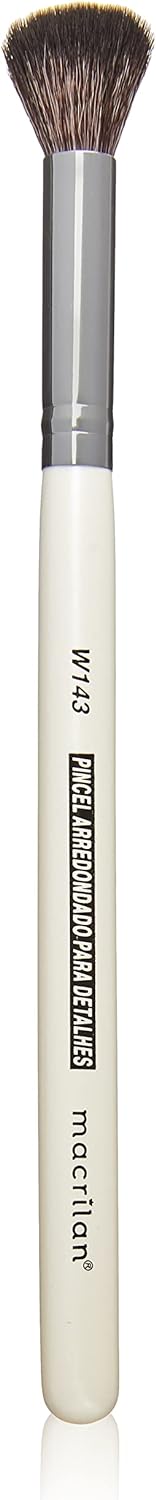 Pincel Macrilan W143 especialmente desenvolvido para aplicar pó e esfumar em áreas menores da face como ao redor dos olhos e boca, lateral e topo do nariz, e em todas as áreas que desejar maior precisão na aplicação. Feito com cerdas super macias e especiais para um resultado impecável.